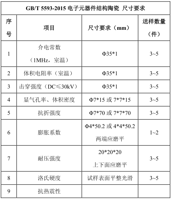 GB/T 5593-2015中涉及的電子陶瓷的其他性能指標,檢測樣品尺寸做如下匯總: